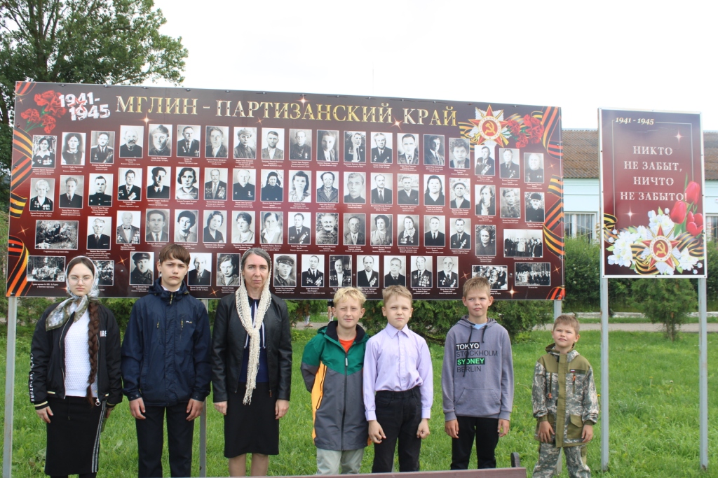 Занятие продолжилось у стенда «Мглин – партизанский край» на городской площади. Светлана Рыжакова напомнила о создании в этих местах партизанских отрядов в августе 1941 года. Решение о формировании трех отрядов – в Разрытовском, Ворминском и Заипутьском лесах – приняли в день оккупации района, за двенадцать часов до вступления фашистов в Мглин. Подводя итог, она подчеркнула, что те испытания, которые выпали на долю партизан и подпольщиков, подвластно было вынести только людям смелым и сильным духом, отважным, мужественным, любящим свою Родину и свой народ.