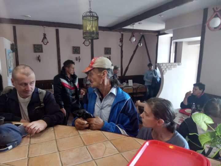 Священник беседует с людьми о Библии и о жизни в благотворительной столовой