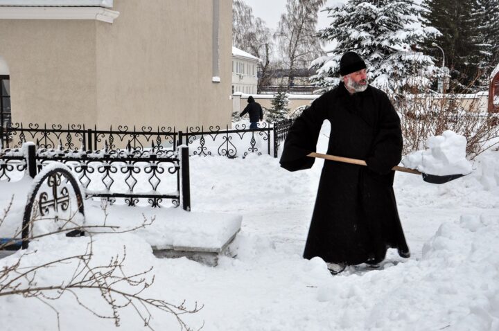 Последствия снегопада на территории собора устраняли добровольцы во главе с архиереем